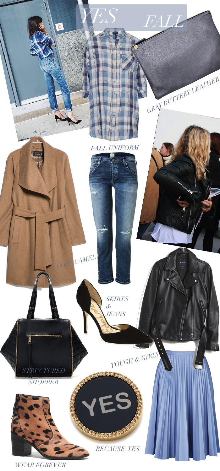plaid shirt, minimal fuss denim and pretty d'orsay pumps. that's a solid uniform right there to get you through early fall. /// i own a clare vivier clutch in navy and it's the softest thing in my closet (what with all my hair shirts and burlap pants) i can only encourage you to make the splurge and get one for yourself. this interesting gray has me wishing i had waited for it. /// i had a motorcycle jacket in the early 90's. mine was boxy and big boo. not flattering at all. this one from madewell has slender arms and a tailored fit. /// i love the color and high waist of this pleated midi skirt, super cute with the leather jacket, don't you think? /// this yes button is ridiculous and i would wear it anyway. it's positive reinforcement. a message to the universe that you are on board with life. /// i want these leopard booties real bad. i don't think i'd take them off. i think there's one size left, and it's not mine. /// i love zara. i love it so much. their bags, sweaters and pants are my favorite. i fell for this shopper as soon as i laid eyes on it. /// have you checked out mango yet? this camel wool blend coat is where it's at if you need something stylish and light weight. i've had my eye on it for a while. it's incredibly affordable. also comes in black and light gray.