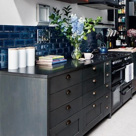 but the dark blue glass tiles (i woulda never thought) and those gray stained drawers in place of cabinets are enough for me.