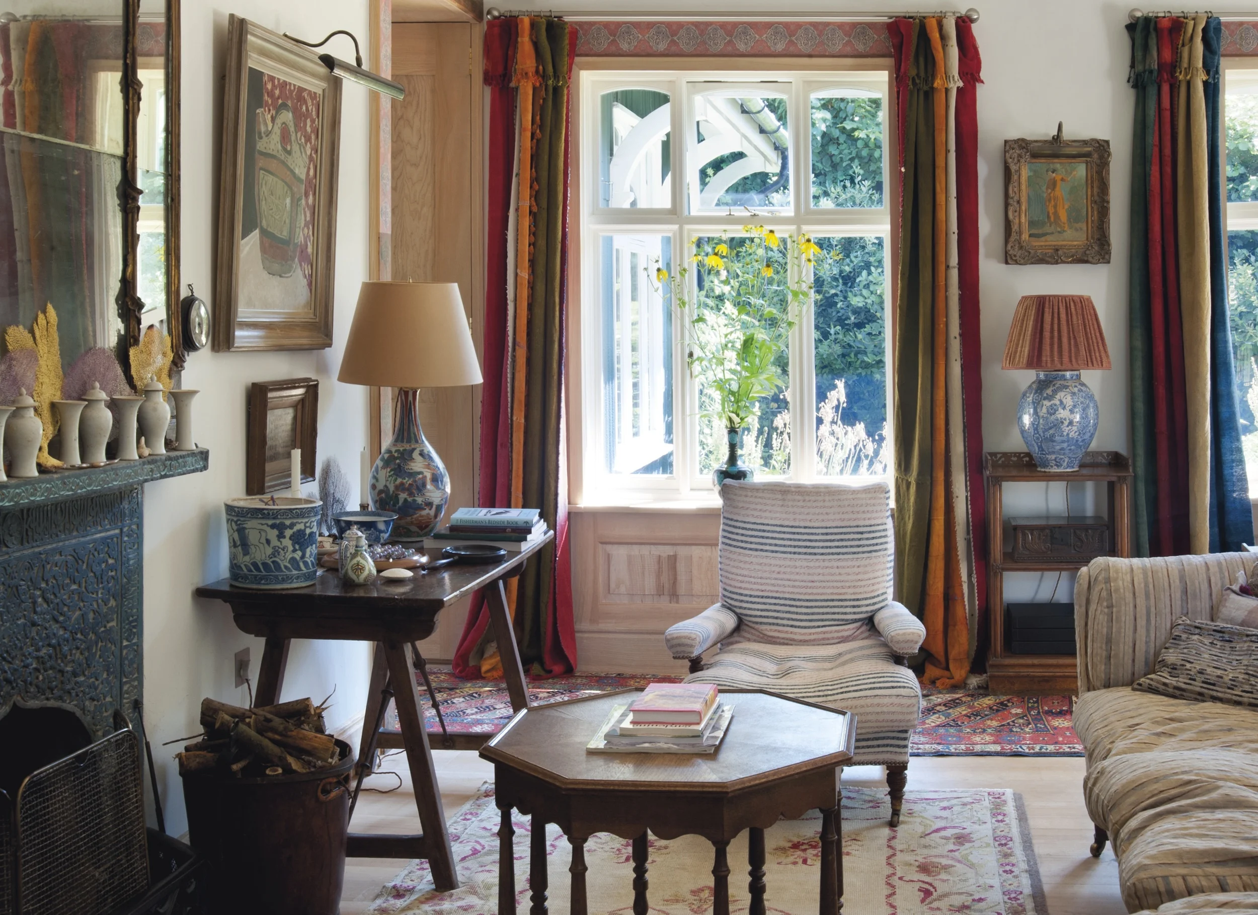 tiger painting / bamboo side table / purple sofa / bright red kilim / blue and white lamp with white shade / cluster of 3 pillows (shhh..they're from pottery barn!) here here and here / amonite fossil / cream slipcovered sofa / gold screen / red and yellow kilim / ottoman / ticking bolster pillow / blue and white jar plus more here / framed textile / blue and white lamp with pink shade