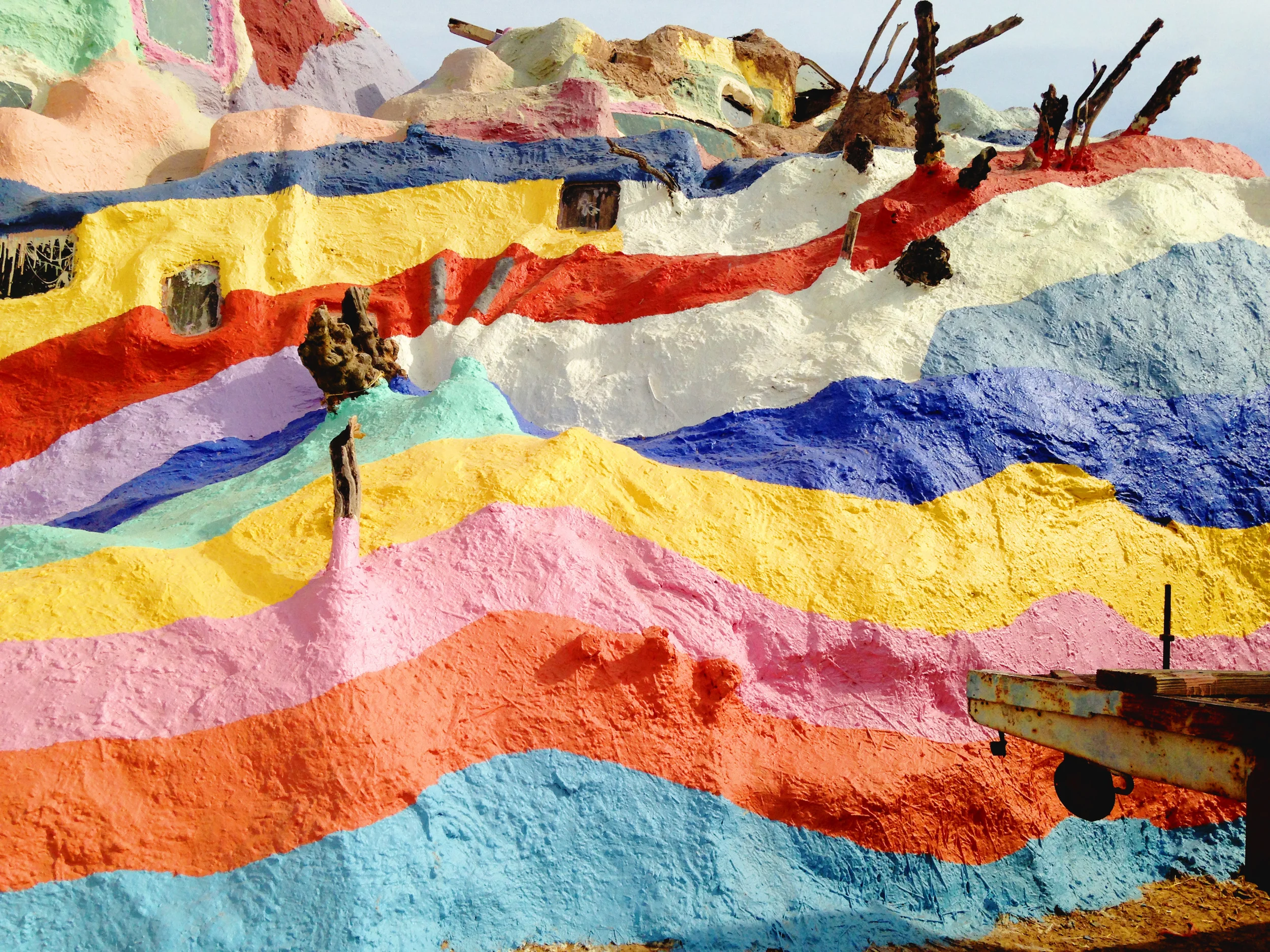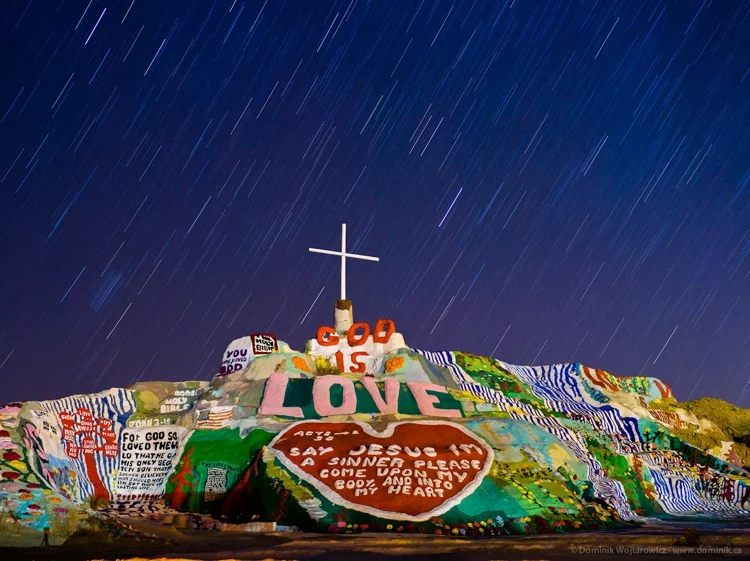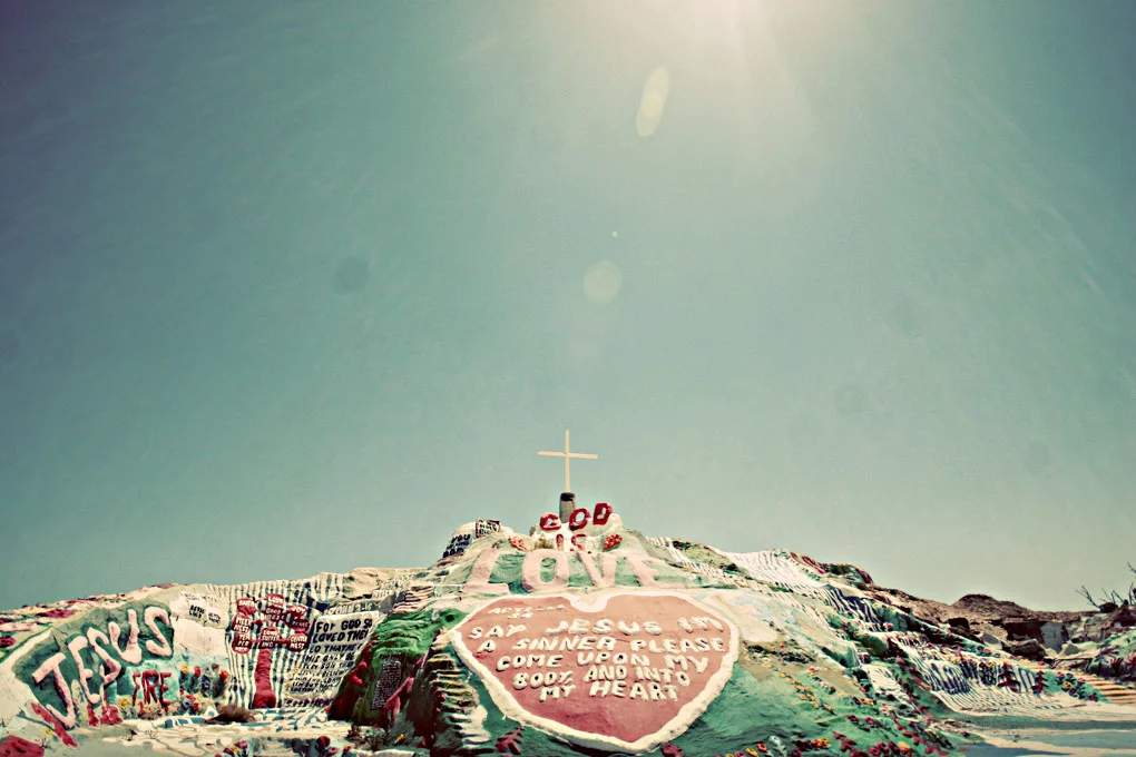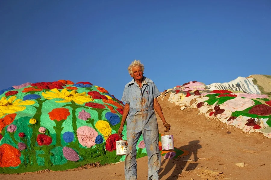 the gist of it is that this guy, leonard knight, at age 35 accepted jesus christ as his savior..you know...he was "saved". he made it his life's calling to spread that word. but he declared accepting jesus could be done easily and efficiently. many churches said it was more complicated and it couldn't be done so easily. i hate churches btw. after a few attempts and failures he built a small mountain (more of a hill really) only to see it crumble. so he built another, stronger one and the rest is history.