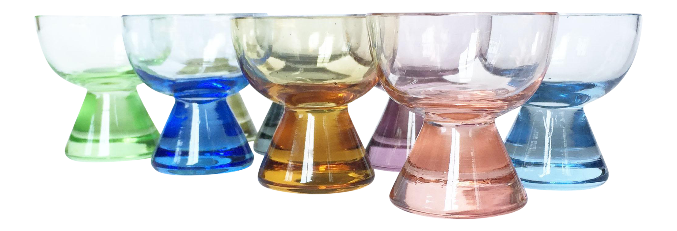 set of 8 colorful vintage cordials (finger bowls all day) (unless you drink cordial) (DO YOU drink CORDIAL?!) (should I be drinking cordial??!!!)