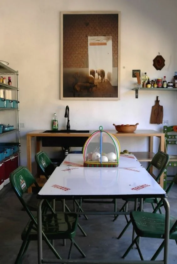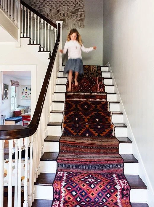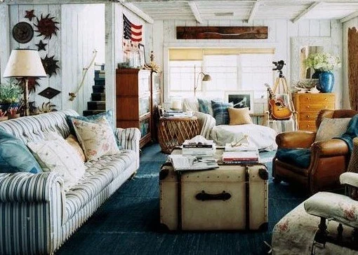 sofa / trunk / distressed kilim / paint / fireplace / leather chair / food posters / vintage patchwork quilt / pendant light / metal dining chairs / extremely long kilim runner / shade garden seed mix / factory shelving cart / foliage pillows / needlepoint pillow / striped chindi pillow / vintage boy scout mugs