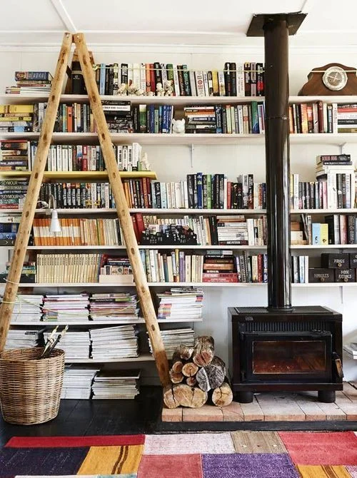 probably a wall of books and a cozy wood burning fireplace.