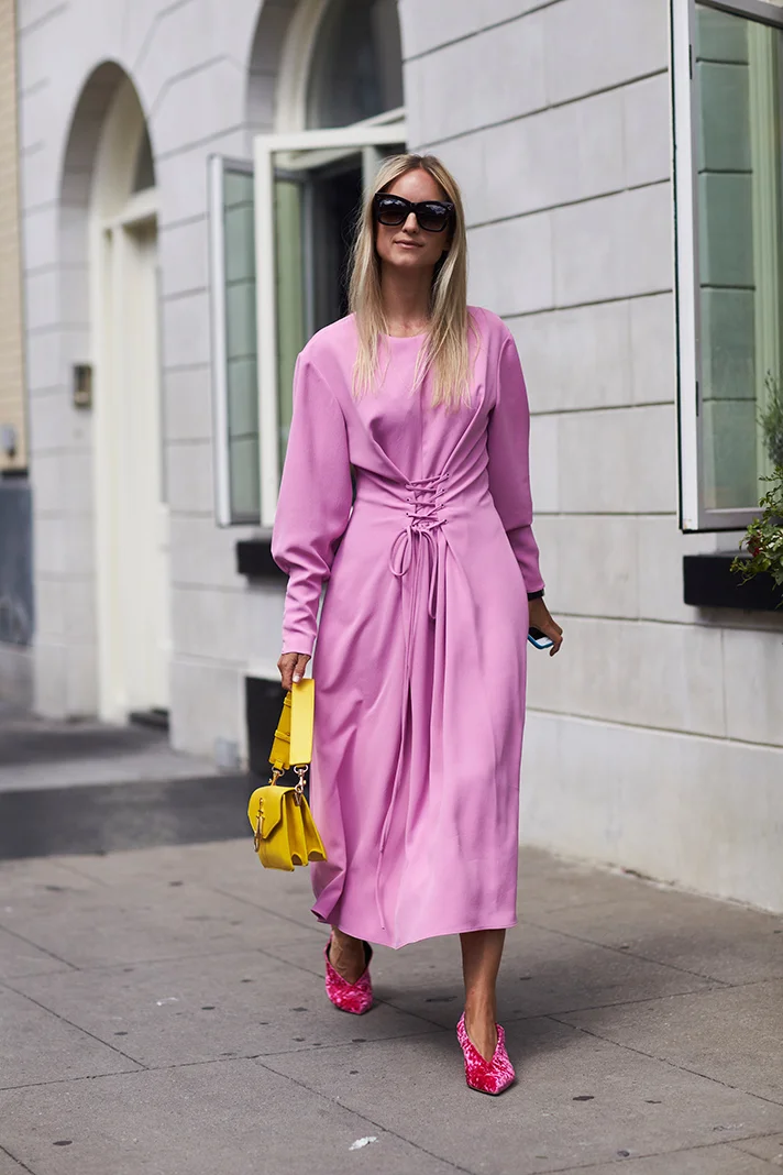 more checked menswear, bright satin, white shoes, contrasting pastels, statement sleeves, belted waists, suiting, and sometimes all of the above on one person. i get it. it's fashion week.