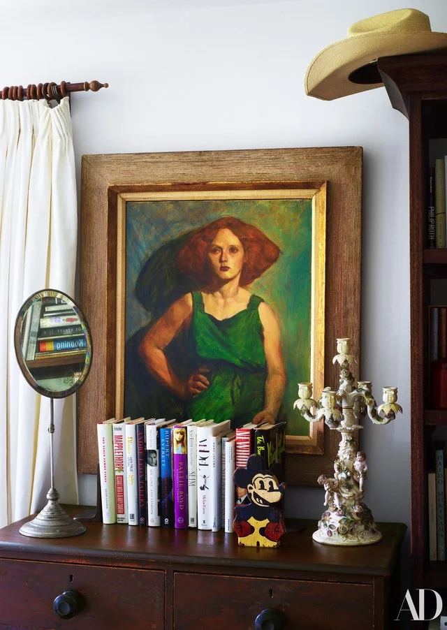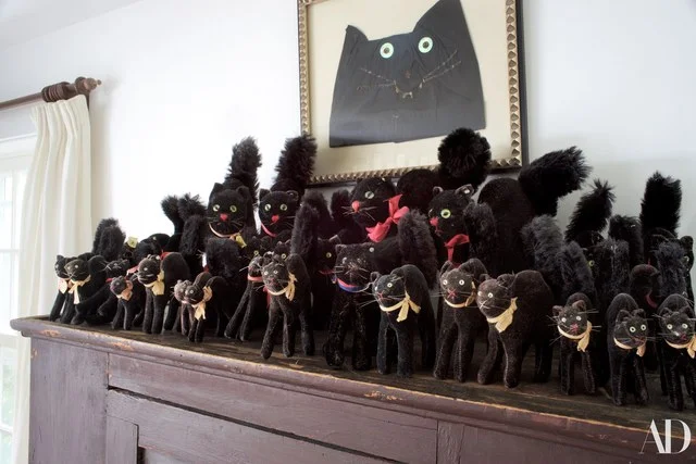 grace painting / plaid throw / sofa / rug / coffee table / steiff black cat / primitive wooden box / leopard pillow / white cat andirons / million dollar cowboy bar print / le fanion tiles / antique mickey figure / girl with cat painting / bayreuth lobster pitcher / candelabra / woman in hat portrait / french cat portrait / vintage pillowcases / pendleton blanket / antique chest of drawers